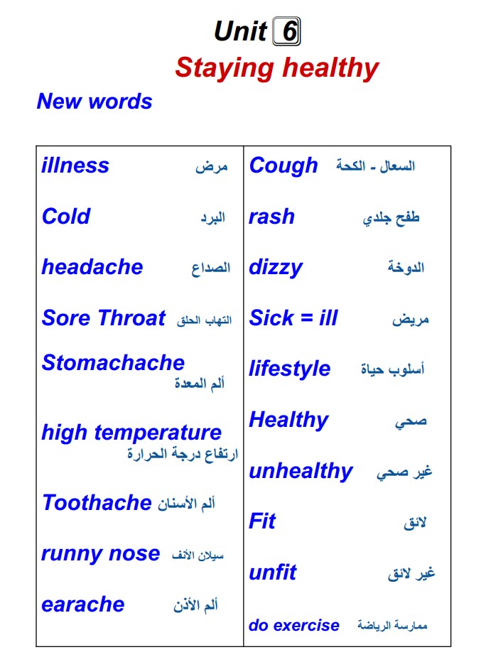 مراجعة الوحدة السادسة الحفاظ على الصحة من خلال المفردات والقواعد والممارسة - إنجليزي الصف 5 الفصل 2