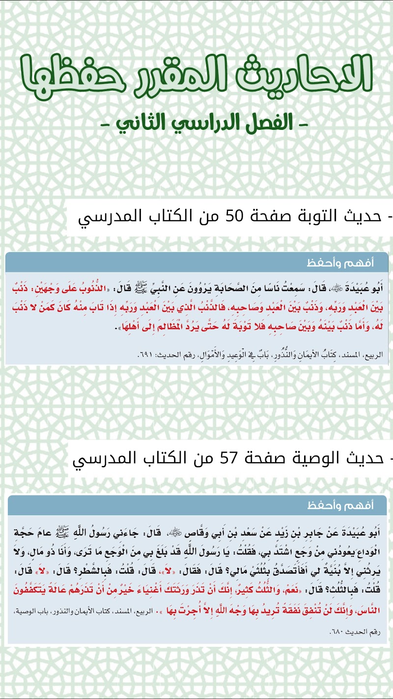 الاحاديث المقرر حفظها - إسلامية الصف 12 الفصل 2