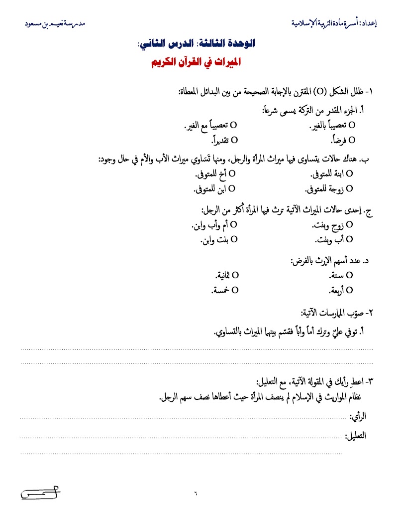 أسئلة امتحانية على درس الميراث - إسلامية الصف 12 الفصل 2