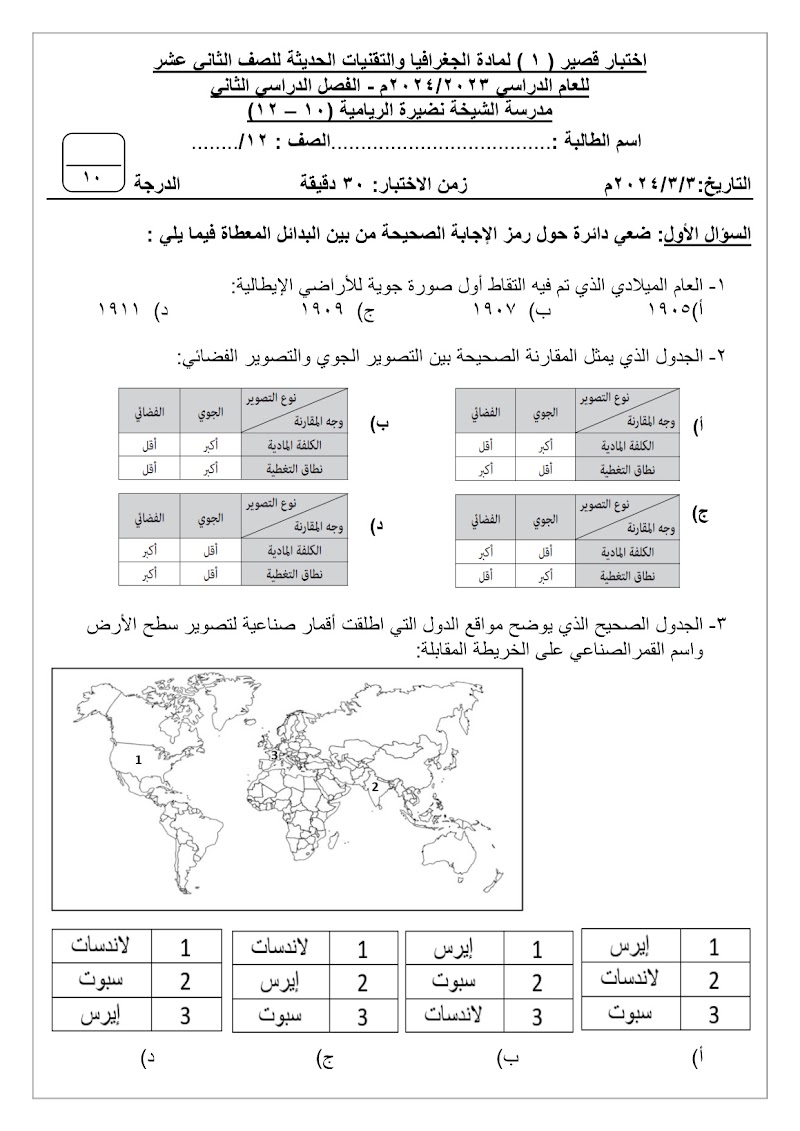 تجميع الاختبارات القصيرة الأولى - جغرافيا الصف 12 الفصل 2