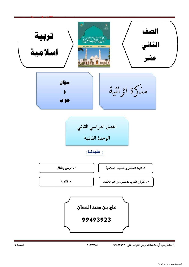 مذكرة إثرائية سؤال وجواب في الوحدة الثانية عقيدتنا - إسلامية الصف 12 الفصل 2