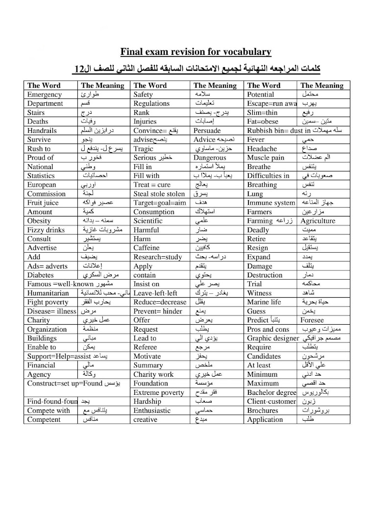 كلمات المراجعة النهائية لجميع الامتحانات السابقة في المادة - إنجليزي الصف 12 الفصل 2