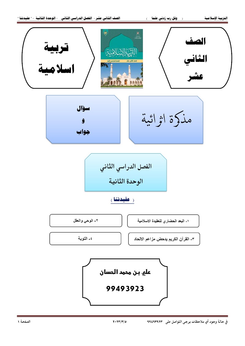أسئلة اختبارات قصيرة ونهائية للوحدة الثانية مع الإجابة - إسلامية الصف 12 الفصل 2