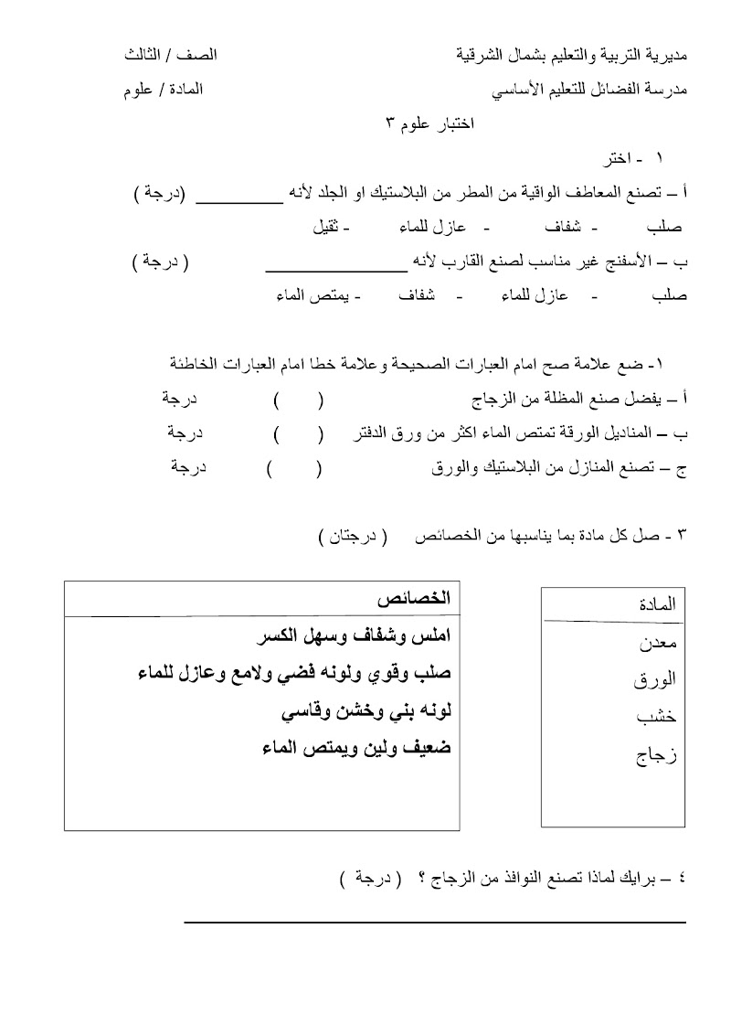 اختبار قصير ثالث - علوم الصف 3 الفصل 2 (2)
