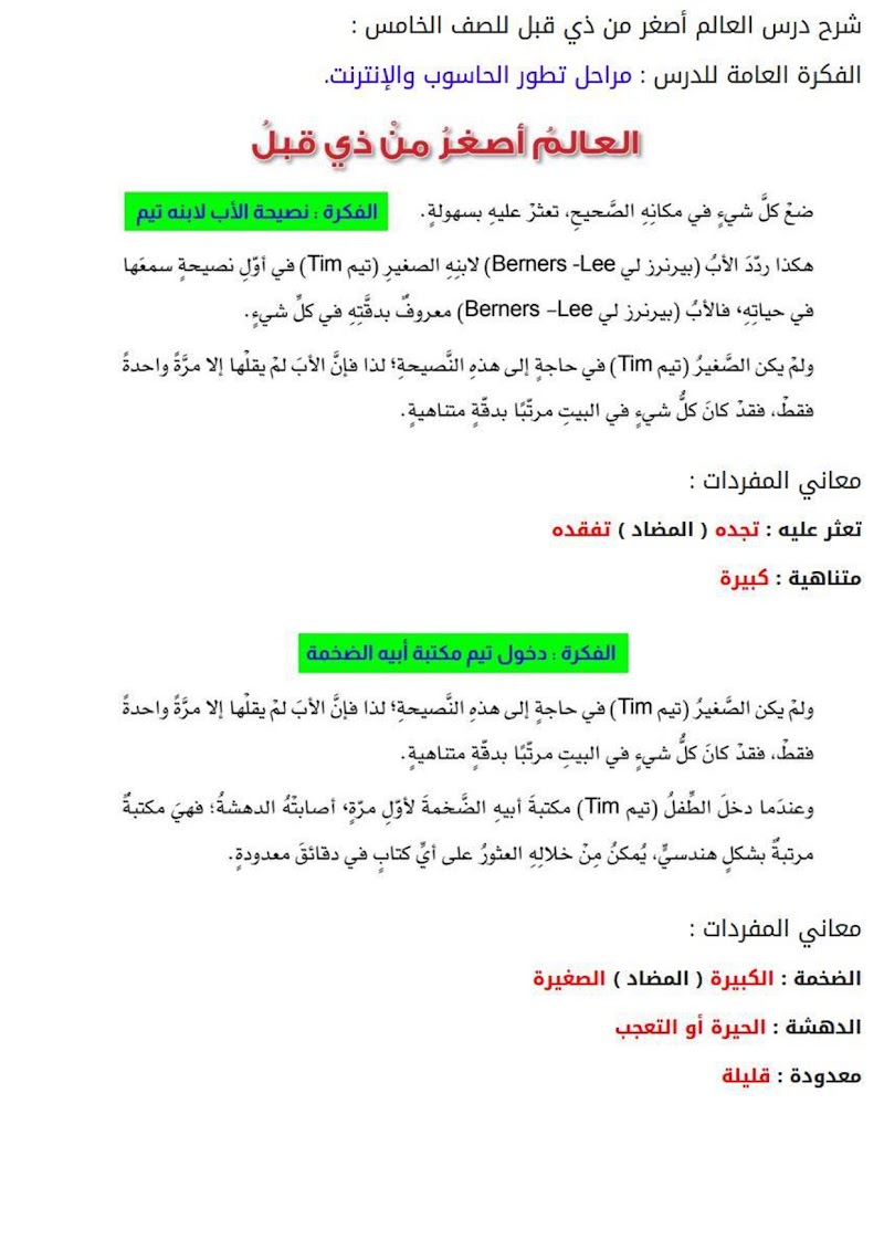 شرح درس العالم أصغر من ذي قبل - عربي الصف 5 الفصل 2