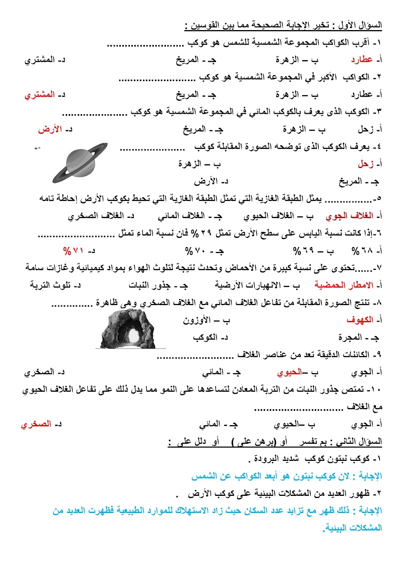 أسئلة مراجعة للوحدة الأولى - أغلفة كوكب الأرض - الأغلفة والموارد الطبيعية - دراسات الصف 5 الفصل 2 - شرح