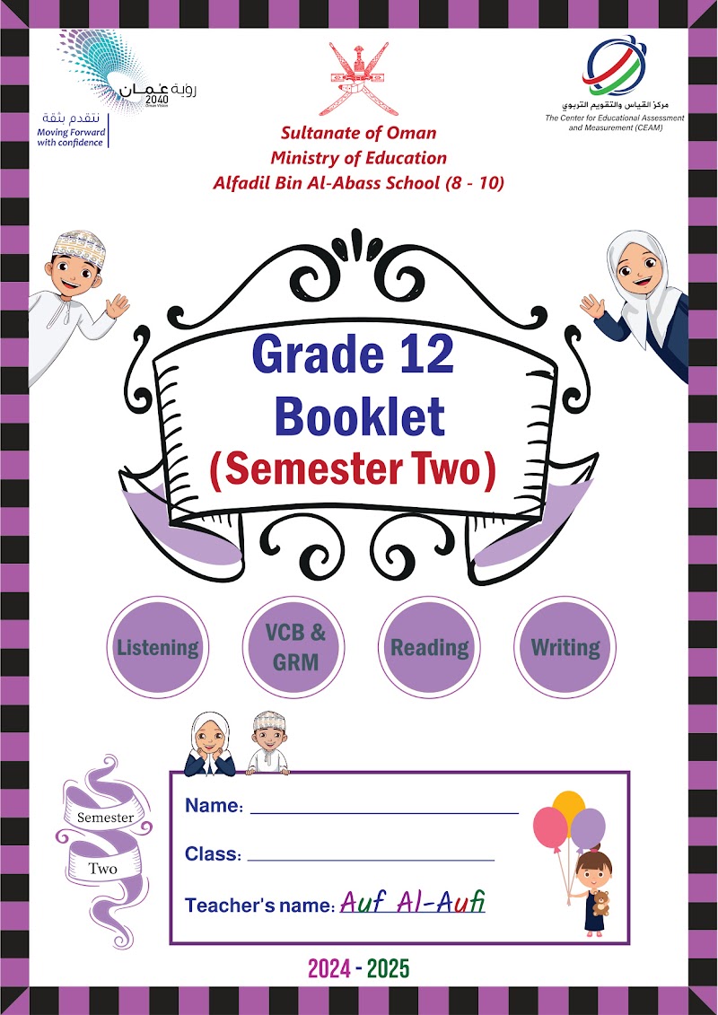 يُعتبر كتيب المادة مع الحل (Booklet) لمادة اللغة الإنجليزية للصف الثاني عشر في الفصل الدراسي الثاني أداة مساعدة قيمة للطلاب. فهو يجمع بين ملخصات مركزة للدروس والقواعد اللغوية المقررة، مع تقديم نماذج للإجابات النموذجية على التمارين والأنشطة. يساعد هذا الكتيب الطالب على مراجعة المحتوى الرئيسي للمنهج بشكل منظم، ويفسح له المجال لفهم طريقة صياغة الإجابات الدقيقة، مما يعزز ثقته ويؤهله بشكل أفضل لمواجهة أسئلة الامتحانات في هذا الفصل الحاسم.