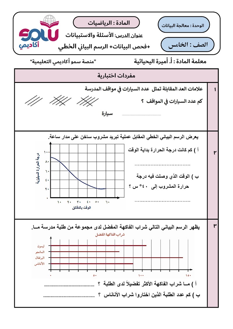 📁 انشطة وأسئلة اختبارية لدروس الأسئلة والاستبيانات و تحليل البيانات و الرسم البياني الخطي - رياضيات الصف 5 الفصل 2
