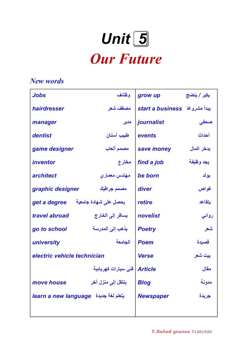 تلخيص الوحدة الخامسة مستقبلنا - إنجليزي الصف 7 الفصل 2