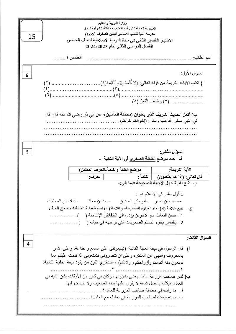 تجميع إختبارات قصيرة 2 - إسلامية الصف 5 الفصل 2