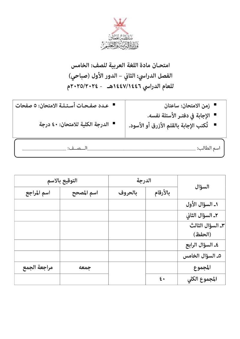 تجميع إمتحانات نهائية 2024-2025 - عربي الصف 5 الفصل 2