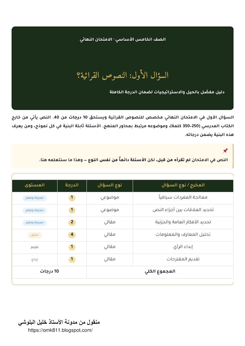 يُعدّ درس استراتيجيات الإجابة على أسئلة النصوص القرائية في مادة اللغة العربية للصف الخامس خلال الفصل الدراسي الثاني خطوة عملية مهمة لتعزيز مهارات الفهم لدى الطالب. فهو لا يقتصر على قراءة النص فحسب، بل يعلّم الطالب كيفية تحليل السؤال بدقة، والبحث عن المعلومة المطلوبة ضمن فقرات النص، وصياغة الإجابة بلغته الخاصة مع الحفاظ على المعنى الأصلي. هذه المهارات تنظم عملية تفكير الطالب وتجعله أكثر قدرة على التعامل مع نصوص متنوعة، مما يدعمه في مراجعة منهج المادة لهذا الفصل ويزيد من ثقته أثناء الاختبارات.